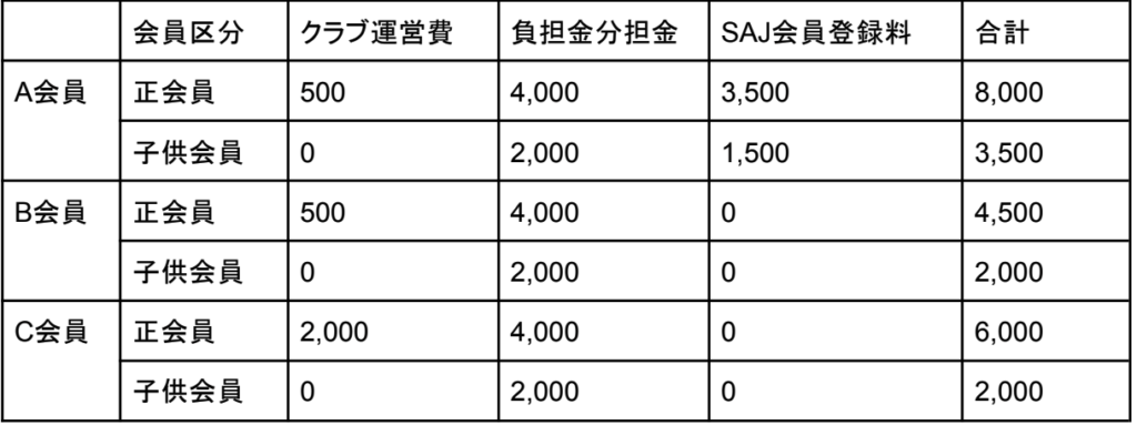 1.年会費は、クラブ運営金、負担分担金、SAJ会員登録料からなり、別表の通りとする。